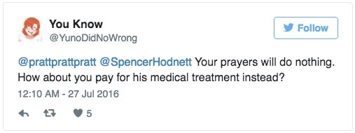 However, the backlash has yet to deter Pratt from believing in the power of prayer and boldly asking others to join him.