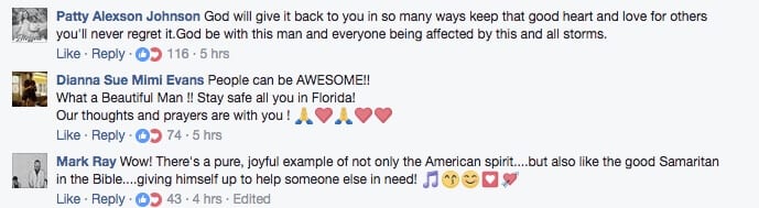 “There’s a pure, joyful example of not only the American spirit…but also like the good Samaritan in the Bible…giving himself up to help someone else in need,” writes Facebook user Mark Ray.