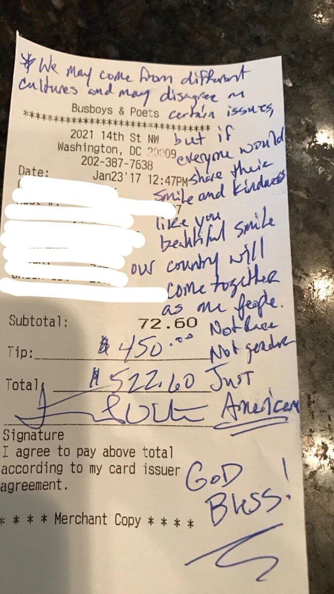 White later explained that the $450 tip was a nod to the 45th president, and a symbolic gesture saying he hoped everyone could move forward together. Being in Washington for Trump’s inauguration and then witnessing the Women’s March the next day, White felt both events represented the very definition of what it means to be an American.